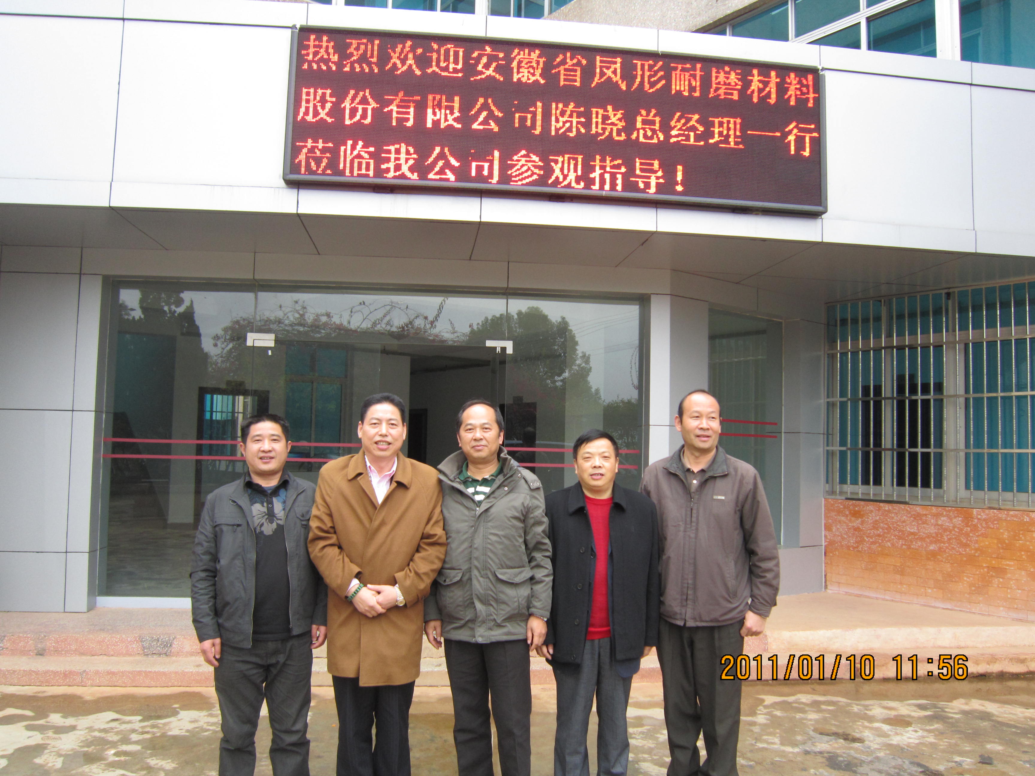 作者:管理員時間:2011-01-112011年1月10日,安徽省鳳形耐磨材料股份有限公司陳曉總經理一行蒞臨我公司參考指導,雙方就耐磨材料的生產、銷售進行了深入的經驗交流。編輯:范太寶 校對:張 文...